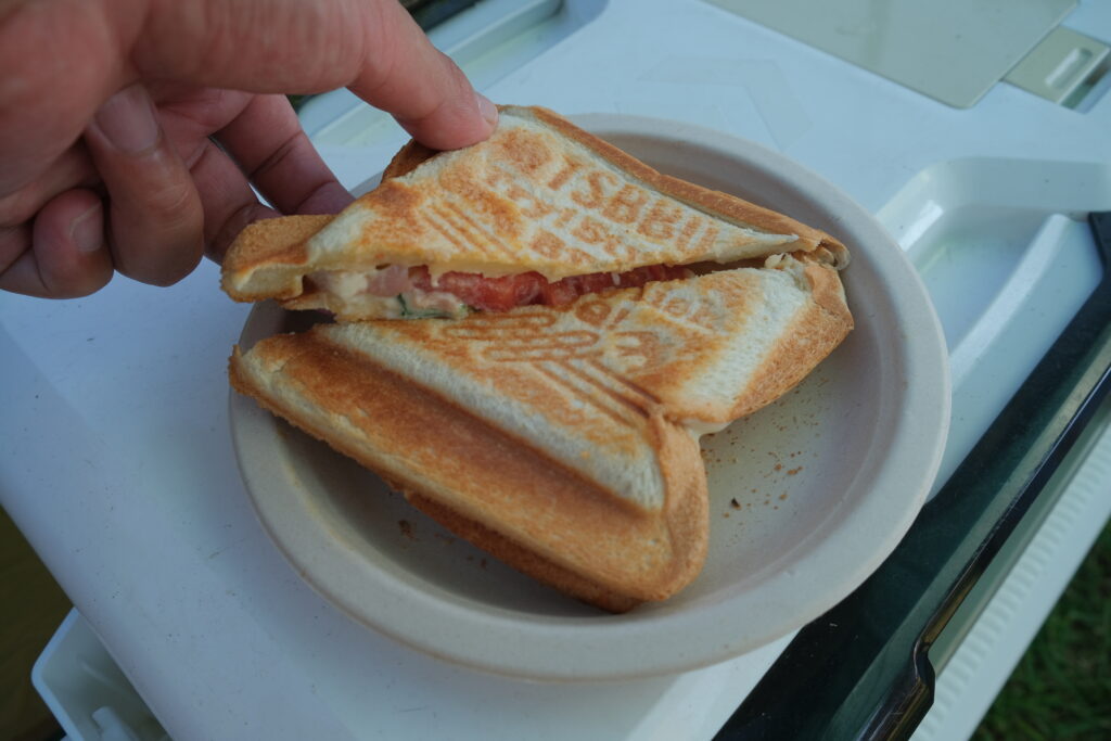 朝ご飯はバジルとチーズをふんだんに入れたホットサンド。